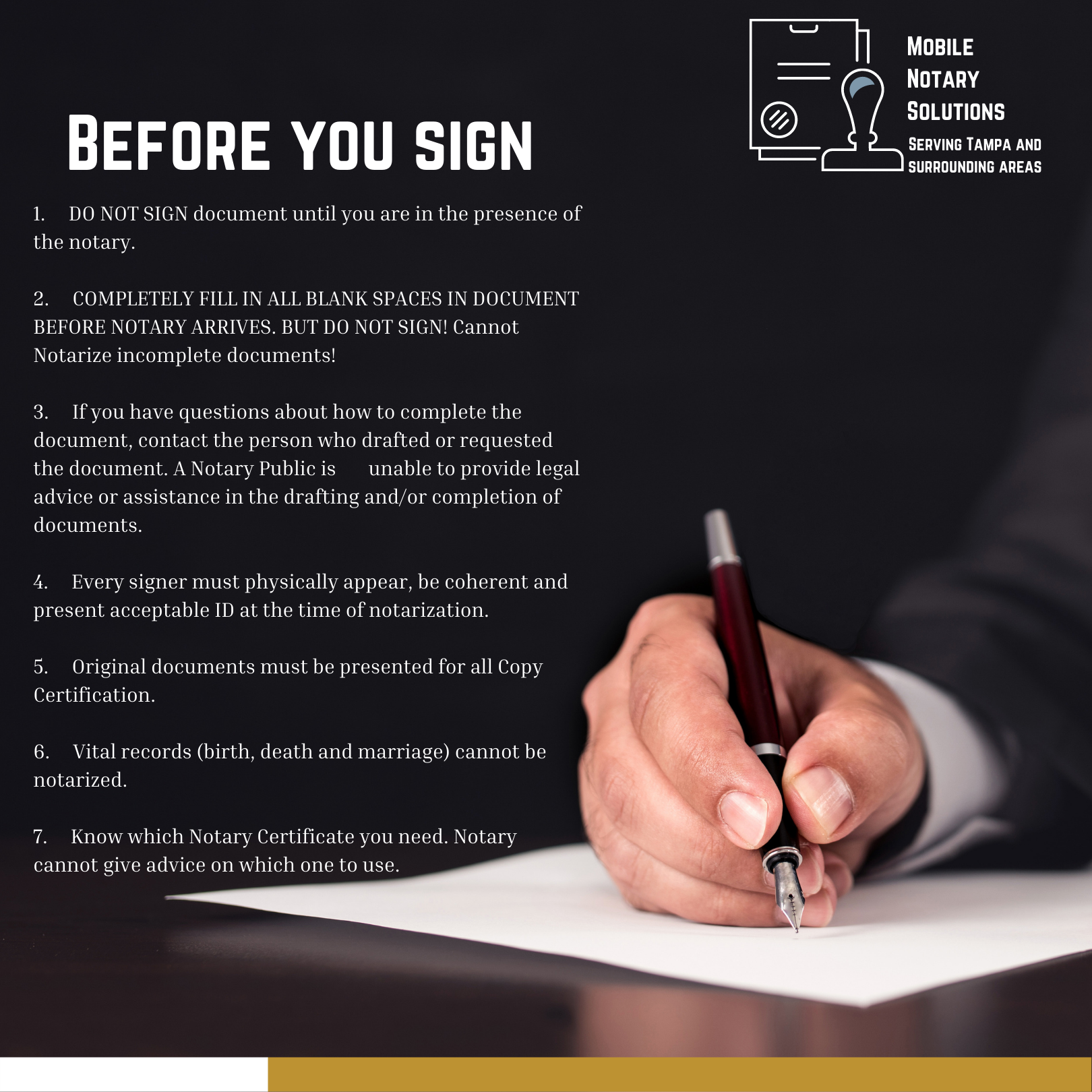 Here at Mobile Notary Solutions, We promise to ensure that your notarizations meet all state guidelines.